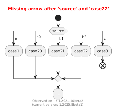 @startuml title <color:red> Missing arrow after 'source' and 'case22' start switch (source) case ( a ) :case1; case ( b0 ) :case20; case ( b1 ) :case21; case ( b2 ) :case22; case ( c ) :case3; end endswitch :...; footer Observed on : 1.2021.10beta2\n(current version: %version()) @enduml