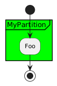 @startuml skinparam PartitionBackgroundColor #00ff00 skinparam PackageBackgroundColor #ff0000 start Partition MyPartition { :Foo; } stop @enduml