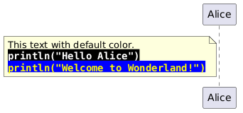 @startuml !function $my_code($fgcolor, $bgcolor) !return "<color:"+$fgcolor+"><back:"+$bgcolor+"><size:14><b><font:monospaced>" !endfunction participant Alice note left of Alice This text with default color. $my_code(white, black)println("Hello Alice") $my_code(yellow, blue)println("Welcome to Wonderland!") end note @enduml
