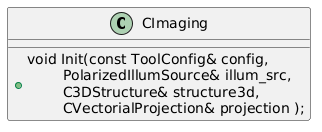 @startuml class CImaging { +void Init(const ToolConfig& config,\n\ PolarizedIllumSource& illum_src,\n\ C3DStructure& structure3d,\n\ CVectorialProjection& projection ); } @enduml