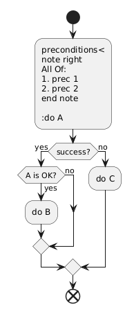 @startuml start :preconditions< note right All Of: # prec 1 # prec 2 end note :do A; if(success?)then(yes) if(A is OK?)then(yes) :do B; else(no) endif else(no) :do C; endif end @enduml