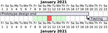 @startgantt today is 2021-01-11 and is colored in #ff1111aa Project starts the 1st of january 2021 [Prototype design end] as [TASK1] lasts 19 days Then [Testing] lasts 4 days [TASK1]->[Testing] 2021-01-08 to 2021-01-14 are colored in #33ff3333 @endgantt