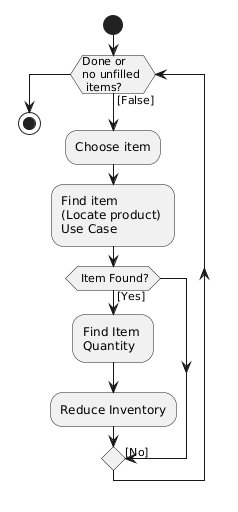 @startuml start while (Done or \nno unfilled \n items?) -> [False]; :Choose item; :Find item \n(Locate product) \nUse Case; if ( Item Found?) -> [Yes]; 'else (yes) :Find Item \nQuantity; :Reduce Inventory; else -> [No]; endif endwhile -> [True]; stop @enduml