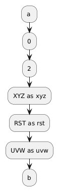 @startuml !$partlen=2 !$data={"partlen": "2", "participants" :[ {"name": "XYZ" ,"as": "xyz"}, {"name": "RST" ,"as": "rst"}, {"name": "UVW" ,"as": "uvw"} ] } !$partlen=$data.partlen !$i=0 :a ; :$i; :$partlen; !foreach $part in $data.participants :$part.name as $part.as; !endfor :b; @enduml