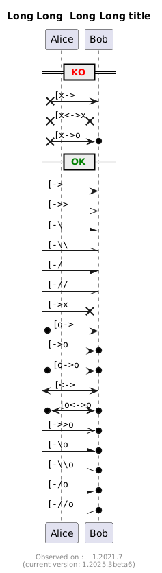 @startuml title Long Long Long Long title participant Alice as a participant Bob as b == <color:red> KO == [x-> b : ""[x-> "" [x<->x b : ""[x<->x"" [x->o b : ""[x->o "" == <color:green> OK == [-> b : ""[-> "" [->> b : ""[->> "" [-\ b : ""[-\ "" [-\\ b : ""[-\\\\"" [-/ b : ""[-/ "" [-// b : ""[-// "" [->x b : ""[->x "" [o-> b : ""[o-> "" [->o b : ""[->o "" [o->o b : ""[o->o "" [<-> b : ""[<-> "" [o<->o b : ""[o<->o"" [->>o b : ""[->>o "" [-\o b : ""[-\o "" [-\\o b : ""[-\\\\o"" [-/o b : ""[-/o "" [-//o b : ""[-//o "" footer \nObserved on : 1.2021.7\n(current version: %version()) @enduml