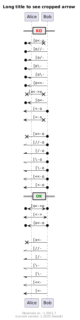 @startuml title Long title to see cropped arrow participant Alice as a participant Bob as b == <color:red> KO == [o<-x b : "" [o<-x"" [o//- b : "" [o//-"" [o/- b : "" [o/-"" [o\\- b : "" [o\\-"" [o\- b : "" [o\-"" [o<<- b : "" [o<<-"" [x<->x b : ""[x<->x"" [o<- b : "" [o<-"" [<-o b : "" [<-o"" [<-x b : "" [<-x"" ... [x<-o b : "" [x<-o"" [//-o b : "" [//-o"" [/-o b : "" [/-o"" [\\-o b : "" [\\-o"" [\-o b : "" [\-o"" [<<-o b : "" [<<-o"" [<-o b : "" [<-o"" == <color:green> OK == [o<->o b : ""[o<->o"" [<-> b : "" [<->"" [o<-o b : "" [o<-o"" ... [x<- b : "" [x<-"" [//- b : "" [//-"" [/- b : "" [/-"" [\\- b : "" [\\-"" [\- b : "" [\-"" [<<- b : "" [<<-"" [<- b : "" [<-"" footer \nObserved on : 1.2021.7\n(current version: %version()) @enduml