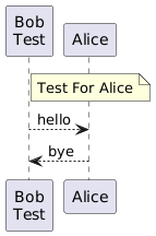 @startuml Hide Empty Description Participant "Bob\nTest" as Bob Participant Alice Note over Alice: Test For Alice Bob --> Alice : hello Alice --> Bob : bye @enduml