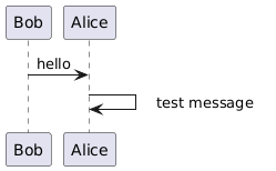 @startuml <style> note { linecolor #white backgroundcolor #white shadowing 0 } </style> Bob -> Alice : hello Alice -> Alice note right: test message @enduml
