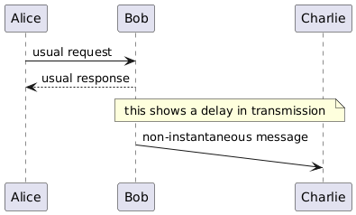 @startuml participant Alice as A participant Bob as B participant Charlie as C A -> B : usual request A <-- B : usual response note over B, C : this shows a delay in transmission B ->(25) C : non-instantaneous message @enduml