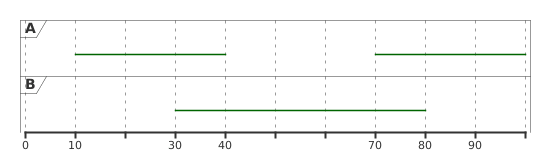 @startuml concise "A" as A concise "B" as B ' participant oriented @A 0 is {hidden} 10 is {-} 40 is {hidden} 70 is {-} @B 0 is {hidden} 30 is {-} 80 is {hidden} ' This is a hack to define the range of the time axis. I don't know a better way. 90 is {hidden} @enduml