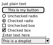 @startuml @startsalt { Just plain text [This is my button] () Unchecked radio (X) Checked radio [] Unchecked box [X] Checked box "Enter text here " ^This is a droplist^ } @endsalt @enduml