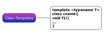 @startmindmap <style> mindmapDiagram { Scale 10 LineColor Black node { FontName Roboto Padding 5 Margin 15 ' RoundCorner 11 LineColor black BackgroundColor #cc33cc-#0c33ac FontColor white LineStyle 0 LineThickness 1 DiagonalCorner 50 } rootNode { Padding 10 FontStyle Italic } leafNode { Padding 7 } .n1 { BackgroundColor white FontStyle bold FontColor black Shadow 0 } } </style> * Class Templates **:template <typename T> class cname{ void f1() ... } <<n1>>; @endmindmap