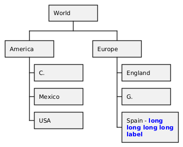 @startwbs <style> node { MinimumWidth 100 MaximumWidth 100 } </style> * World ** America *** C. *** Mexico *** USA ** Europe *** England *** G. *** Spain - **<color:blue>long long long long label** @endwbs