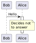 @startuml !pragma teoz true participant Bob participant Alice Bob -> Alice : Hello activate Alice note over Alice : Decides not\nto answer deactivate Alice @enduml