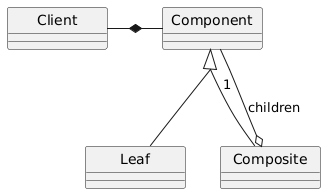 @startuml 'skinparam linetype ortho skinparam groupInheritance 2 skinparam minClassWidth 100 hide circle class Client class Component class Leaf class Composite Client -* Component Component <|-- Leaf Component <|-- Composite Composite o-- "1" Component : children @enduml