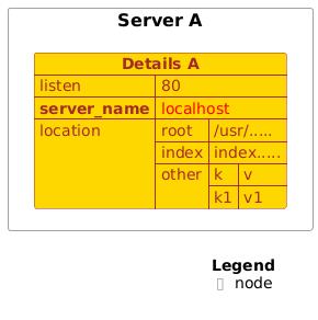 @startuml !include <C4/C4_Deployment> <style> json { BackgroundColor gold LineColor brown FontColor brown } </style> Node(A, "Server A") { json "<b>Details A" as A_Details { "listen": 80, "<b>server_name": "<color:red>localhost", "location": { "root": "/usr/.....", "index": "index.....", "other": {"k": "v", "k1": "v1"} } } } SHOW_LEGEND() @enduml