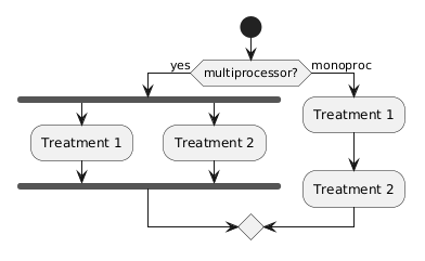 @startuml start if (multiprocessor?) then (yes) fork :Treatment 1; fork again :Treatment 2; end fork else (monoproc) :Treatment 1; :Treatment 2; endif @enduml