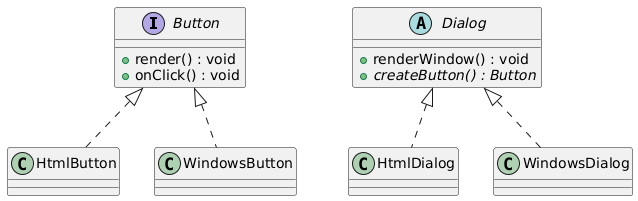 @startuml interface Button { + render() : void + onClick() : void } class HtmlButton { } class WindowsButton { } Button <|.. HtmlButton Button <|.. WindowsButton abstract Dialog { + renderWindow() : void + {abstract} createButton() : Button } class HtmlDialog { } class WindowsDialog { } Dialog <|.. HtmlDialog Dialog <|.. WindowsDialog @enduml