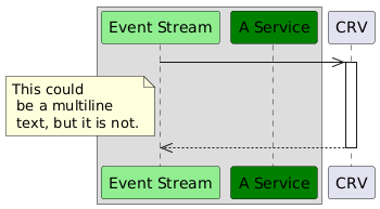 @startuml /' Macros '/ !definelong Event(from, to, notes) from ->> to ++ note left of from : notes return !enddefinelong '/ End Macros/' box participant "Event Stream" as K #LightGreen participant "A Service" as SRV #Green end box Event(K, CRV, "This could \n be a multiline \n text, but it is not.") @enduml