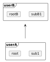 @startuml 'skinparam defaultTextAlignment center skinparam FrameBackgroundcolor white label userA [ {{ frame userA { card root card sub1 } }} ] label userB [ {{ frame userB { card rootB card subB1 } }} ] userA -up-> userB @enduml