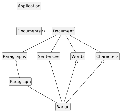 @startuml hide empty members hide circle skinparam shadowing false Application -d- Documents Documents o-r- Document Document -d- Paragraphs Document -d- Sentences Document -d- Words Document -d- Characters Paragraphs o-d- Paragraph Sentences o-d- Range Words o-d- Range Characters o-d- Range Paragraph -d- Range Paragraphs -r[hidden]- Sentences Sentences -r[hidden]- Words Words -r[hidden]- Characters @enduml