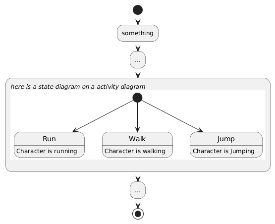 @startuml skinparam Backgroundcolor transparent start :something; :...; :<u><i>here is a state diagram on a activity diagram {{ Run : Character is running Walk : Character is walking Jump : Character is Jumping [*] --> Run [*] --> Walk [*] --> Jump }} ; :...; stop @enduml