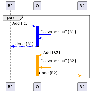 @startuml par R1 -[#blue]> Q : Add [R1] activate Q #blue Q -[#blue]> Q : Do some stuff [R1] R1 <-[#blue]- Q : done [R1] deactivate Q else R2 -[#orange]> Q : Add [R2] activate Q #orange Q -[#orange]> Q : Do some stuff [R2] R2 <-[#orange]- Q : done [R2] deactivate Q end par @enduml