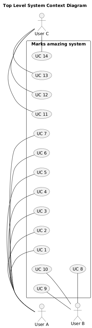 @startuml title Top Level System Context Diagram left to right direction skinparam packageStyle rect :User A: as A :User B: as B :User C: as C rectangle "Marks amazing system" { together { (UC 1) (UC 2) (UC 3) (UC 4) (UC 5) (UC 6) (UC 7) } together { (UC 8) (UC 9) (UC 10) (UC 11) (UC 12) (UC 13) (UC 14) } (UC 1) -[hidden]- (UC 8) A - (UC 1) A - (UC 2) A - (UC 3) A - (UC 4) A - (UC 5) A - (UC 6) A - (UC 7) B -l- (UC 8) B -l- (UC 9) B -l- (UC 10) C -l- (UC 11) C -l- (UC 12) C -l- (UC 13) C -l- (UC 14) } @enduml