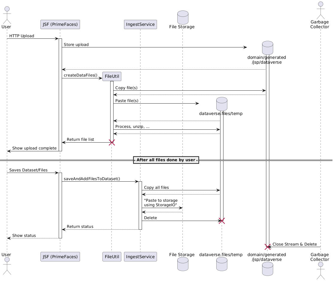 @startuml actor User participant "JSF (PrimeFaces)" as UI participant "FileUtil" as FU participant "IngestService" as IS database "File Storage" as FS database "dataverse.files/temp" as TMP database "domain/generated\n/jsp/dataverse" as GJD actor "Garbage\nCollector" as GC User -> UI : HTTP Upload activate UI create GJD UI -> GJD : Store upload activate GJD GJD --> UI create FU UI -> FU : createDataFiles() activate FU FU -> GJD : Copy file(s) GJD --> FU create TMP FU -> TMP : Paste file(s) activate TMP TMP --> FU FU -> TMP : Process, unzip, ... TMP --> FU FU -> UI : Return file list destroy FU UI -> User : Show upload complete deactivate UI ==== After all files done by user ==== User -> UI: Saves Dataset/Files activate UI UI -> IS : saveAndAddFilesToDataset() activate IS IS -> TMP : Copy all files TMP --> IS IS -> FS : "Paste to storage\nusing StorageIO" FS --> IS IS -> TMP : Delete destroy TMP IS --> UI : Return status deactivate IS UI --> User: Show status deactivate UI GC -> GJD : Close Stream & Delete destroy GJD @enduml