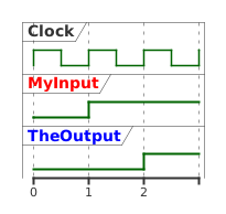 @startuml clock "Clock" as C with period 1 binary "<color:red>MyInput" as I binary "<color:blue>TheOutput" as O @0 I is low I is low @1 I is high @2 O is high @enduml