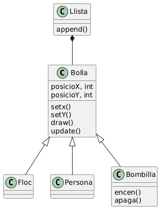 @startuml Bolla <|-- Floc Bolla <|-- Persona Bolla <|-- Bombilla Bolla : posicioX, int Bolla : posicioY, int Bolla : setx() Bolla : setY() Bolla : draw() Bolla : update() Bombilla : encen() Bombilla : apaga() Llista *-- Bolla Llista : append() @enduml