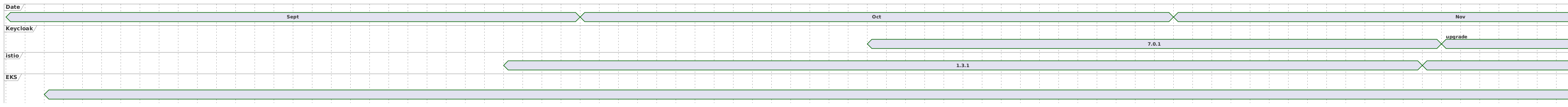 @startuml concise "Date" as date concise "Keycloak" as kc concise "istio" as is concise "EKS" as eks 'scale 10000 as 1 pixels hide time-axis @date 2019/09/01 is Sept 2019/10/01 is Oct 2019/11/01 is Nov 2019/12/01 is Dec 2020/01/01 is Jan 2020/02/01 is Feb 2020/03/01 is Mar 2020/04/01 is Apr 2020/05/01 is May 2020/06/01 is Jun @eks 2019/09/03 is 1.14.0 2020/03/10 is 1.15.0 2020/04/30 is 1.16.0 @2020/03/10 <-> @2020/04/30 : 1.15.0 @kc 2019/10/16 is 7.0.1 2019/11/15 is 8.0.0 : upgrade 2020/02/16 is {-} 2020/02/17 is 9.0.0 2020/04/30 is {hidden} 2020/05/01 is 10.0.0 @is 2019/09/27 is 1.3.1 2019/11/14 is 1.4.0 2020/03/05 is 1.5.0 @enduml