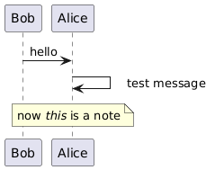 @startuml <style> .thisisnotanote { note { linecolor #white backgroundcolor #white shadowing 0 } } </style> Bob -> Alice : hello Alice -> Alice note<<thisisnotanote>> right: test message note over Alice: now //this// is a note @enduml