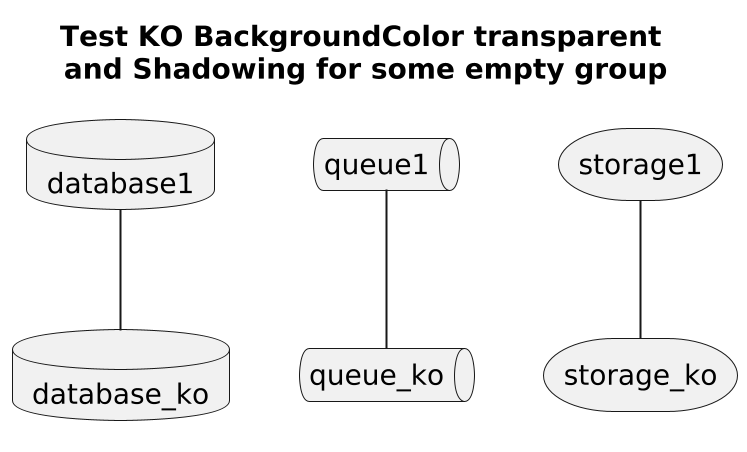 @startuml scale 2 skinparam BackgroundColor transparent title Test **KO** BackgroundColor **transparent**\n and Shadowing for some empty group database database1 database database_ko { } queue queue1 queue queue_ko { } storage storage1 storage storage_ko { } database1--database_ko queue1--queue_ko storage1--storage_ko @enduml