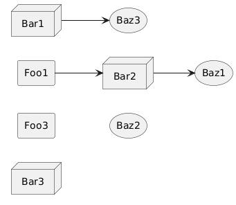 @startuml left to right direction rectangle Foo1 rectangle Foo3 node Bar1 node Bar2 node Bar3 storage Baz1 storage Baz2 storage Baz3 Foo1 --> Bar2 Bar1 --> Baz3 Bar2 --> Baz1 @enduml