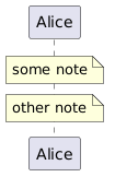 @startuml !unquoted procedure note_over($target, $note) note over $target: $note !endprocedure participant "Alice" as alice note_over(alice, "some note") note_over(alice, other note) @enduml