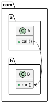 @startuml !pragma useNewPackage set separator . remove @unlinked namespace com.a{ class A{ + call() } class B } namespace com.b{ class B{ + run() } } namespace xxx.test{ class A class C } com.a.A::call-->com.b.B::run @enduml