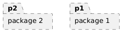 @startuml skinparam shadowing false skinparam package { BorderStyle dashed } ' uncommenting the following line removes BorderStyle for all packages package "package 1" as p1 package "package 2" as p2 { } @enduml
