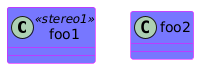 @startuml skinparam classHeaderBackgroundColor #4FF skinparam classBackgroundColor #77F skinparam classBorderColor #F0F skinparam stereotypeC<<stereo1>> { BackgroundColor #FFF BorderColor #FF0 } skinparam spotChar<<stereo1>> Z class foo1 << stereo1 >> class foo2 @enduml