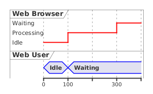 @startuml <style> timingDiagram { robust { LineColor #F00 } concise { LineColor #00F } } </style> robust "Web Browser" as WB concise "Web User" as WU @0 WU is Idle WB is Idle @100 WU is Waiting WB is Processing @300 WB is Waiting @enduml