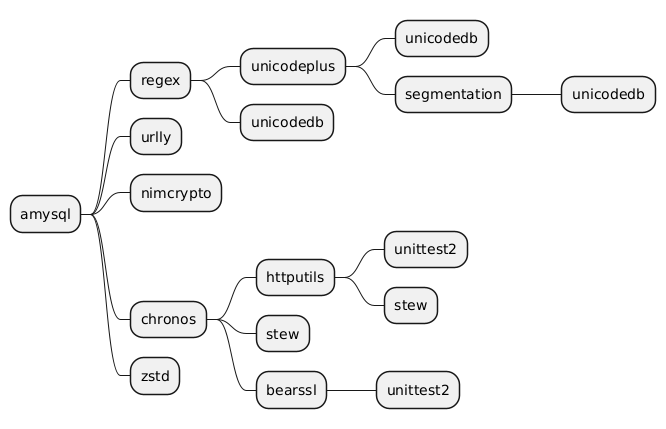 @startmindmap * amysql ** regex *** unicodeplus **** unicodedb **** segmentation ***** unicodedb *** unicodedb ** urlly ** nimcrypto ** chronos *** httputils **** unittest2 **** stew *** stew *** bearssl **** unittest2 ** zstd @endmindmapn