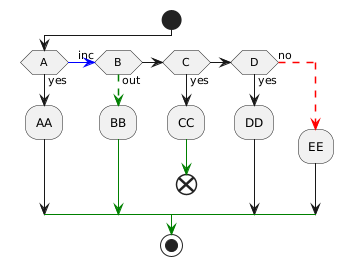 @startuml start if (A) then (yes) :AA; (-[#blue]->inc) elseif (B) then (-[#green,dashed]->out) :BB; -[#green]-> elseif (C) then (yes) :CC; -[#green]-> end elseif (D) then (yes) :DD; else (-[#red,dashed]->no) :EE; endif -[#green]-> stop @enduml