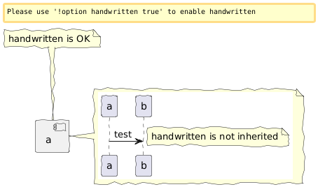 @startuml skinparam handwritten true component a { } note top of a handwritten is OK end note note right of a {{ a->b:test note right handwritten is not inherited end note }} end note @enduml