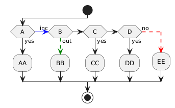 @startuml start if (A) then (yes) :AA; (-[#blue]->inc) elseif (B) then (-[#green,dashed]->out) :BB; elseif (C) then (yes) :CC; elseif (D) then (yes) :DD; else (-[#red,dashed]->no) :EE; endif stop @enduml