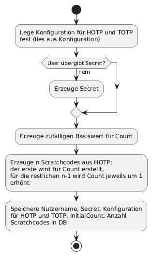 @startuml skinparam componentStyle uml2 start :Lege Konfiguration für HOTP und TOTP fest (lies aus Konfiguration); if (User übergibt Secret?) then (nein) :Erzeuge Secret; endif :Erzeuge zufälligen Basiswert für Count; :Erzeuge n Scratchcodes aus HOTP: der erste wird für Count erstellt, für die restlichen n-1 wird Count jeweils um 1 erhöht; :Speichere Nutzername, Secret, Konfiguration für HOTP und TOTP, InitialCount, Anzahl Scratchcodes in DB; stop @enduml