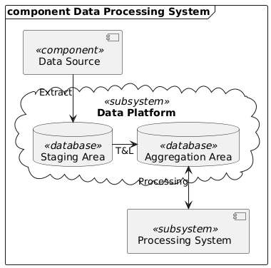 @startuml skinparam shadowing false skinparam componentStyle uml2 skinparam lineType ortho frame "component Data Processing System" { Component "Data Source" as DS <<component>> Cloud "Data Platform" <<subsystem>> { Database "Staging Area" as SQLSA <<database>> Database "Aggregation Area" as SQLAA <<database>> } Component "Processing System" as SPT <<subsystem>> ''Data Platform SQLSA -> SQLAA <<dataflow>>: T&L SQLAA <--> SPT <<dataflow>>: Processing ''Data Source DS --> SQLSA <<dataflow>>: Extract } @enduml