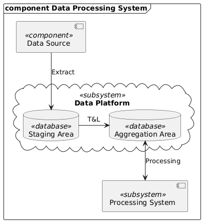 @startuml skinparam shadowing false skinparam componentStyle uml2 ''skinparam lineType ortho frame "component Data Processing System" { Component "Data Source" as DS <<component>> Cloud "Data Platform" <<subsystem>> { Database "Staging Area" as SQLSA <<database>> Database "Aggregation Area" as SQLAA <<database>> } Component "Processing System" as SPT <<subsystem>> ''Data Platform SQLSA -> SQLAA <<dataflow>>: T&L SQLAA <--> SPT <<dataflow>>: Processing ''Data Source DS --> SQLSA <<dataflow>>: Extract } @enduml