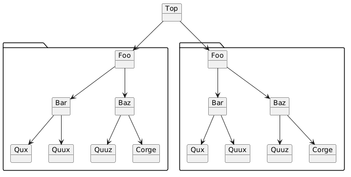 @startuml !unquoted procedure myGroup($as) namespace $as { object "Foo" as $as.Foo object "Bar" as $as.Bar object "Baz" as $as.Baz object "Qux" as $as.Qux object "Quux" as $as.Quux object "Quuz" as $as.Quuz object "Corge" as $as.Corge Foo --> Bar Foo --> Baz Bar --> Qux Bar --> Quux Baz --> Quuz Baz --> Corge } !end procedure object Top myGroup(myGroup1) myGroup(myGroup2) Top --> myGroup1.Foo Top --> myGroup2.Foo @enduml