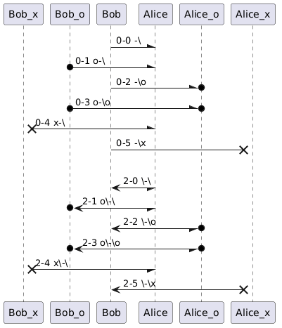 @startuml participant Bob_x participant Bob_o participant Bob participant Alice participant Alice_o participant Alice_x Bob -\ Alice : 0-0 -\ Bob_o o-\ Alice : 0-1 o-\ Bob -\o Alice_o : 0-2 -\o Bob_o o-\o Alice_o : 0-3 o-\o Bob_x x-\ Alice : 0-4 x-\ Bob -\x Alice_x : 0-5 -\x ||| Bob \-\ Alice : 2-0 \-\ Bob_o o\-\ Alice : 2-1 o\-\ Bob \-\o Alice_o : 2-2 \-\o Bob_o o\-\o Alice_o : 2-3 o\-\o Bob_x x\-\ Alice : 2-4 x\-\ Bob \-\x Alice_x : 2-5 \-\x @enduml
