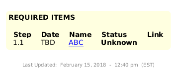 @startuml skinparam LegendBackgroundColor #lightyellow skinparam LegendBorderThickness 0 legend bottom <b>REQUIRED ITEMS</b> <#lightyellow,#lightyellow>|= Step |= Date |= Name |= Status |= Link | | 1.1 | TBD | [[https://www.asdasd.com/apps/documents/items/1965 ABC]] |<color:black> <b>Unknown | | endlegend center footer \nLast Updated: February 15, 2018 - 12:40 pm (EST) @enduml